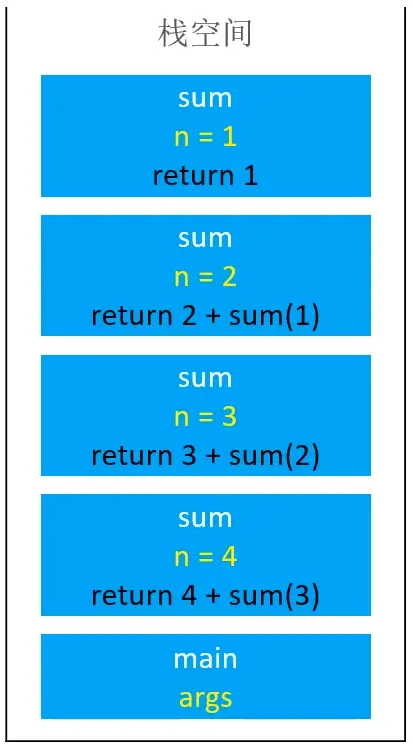 - 同样的,sum(2)内部会继续调用sum(1),所以又会继续为sum(1)开辟栈空间,并且传入的参数为1,所以内存结构如下