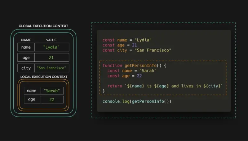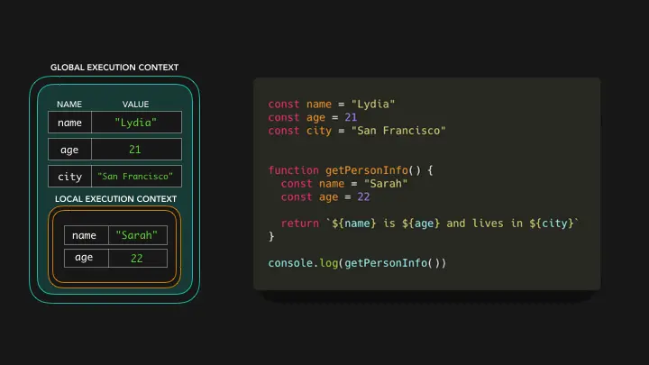 在全局上下文中,我们用San Francisco的值声明了变量city,因此有一个对变量city的引用。现在我们有了变量的值,函数getPersonInfo可以返回字符串Sarah is 22 and lives in San Francisco 。