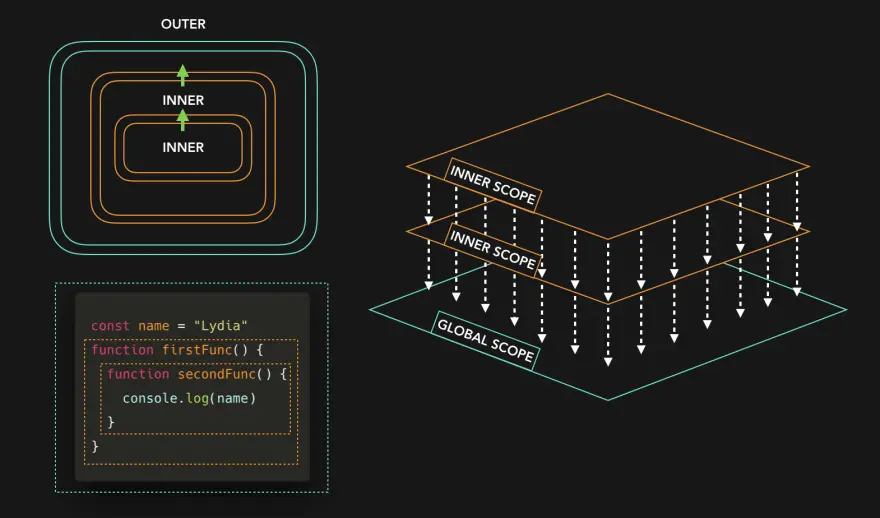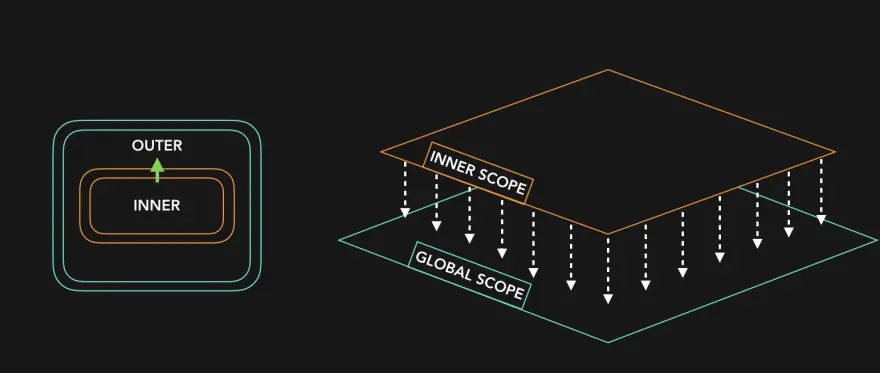 我们可以沿着作用域链向下走,但是我们不能沿着作用链向上走,这可能会让人困惑,因为我们大都会说“向上”而不是“向下”,所以换一种说法:你可以进入外部作用域,但不能进入内部作用域,可以把它想象成瀑布模型: