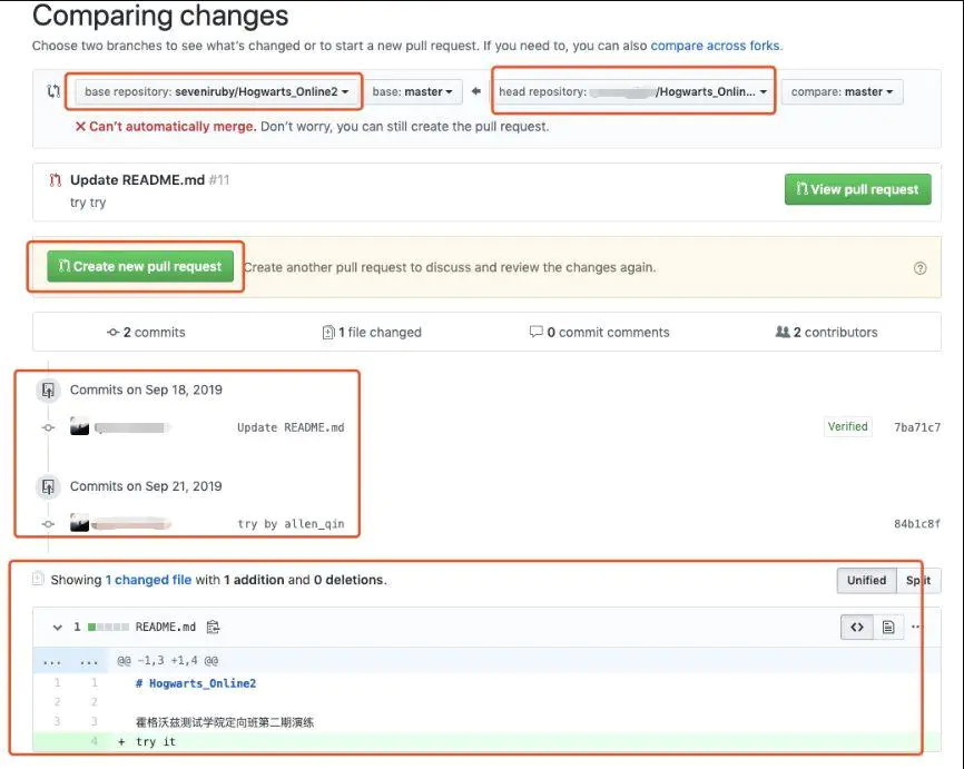4.2)这个时候我们点击Create new pull request按钮,填写描述后再点击Create new pull request按钮: