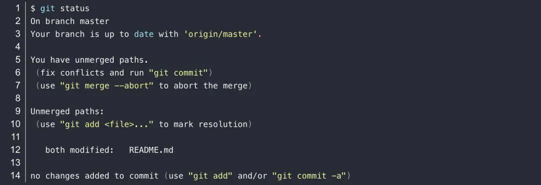 结果中我们发现产生了冲突,再使用git status命令查看: