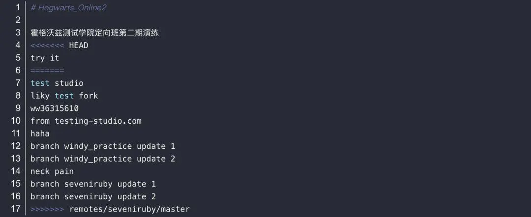 这种展示模式的意思是以等号=为分隔符,等号上方为当前分支的修改,等号下方为远程分支的修改,这样就产生的冲突,我们可以手动进行修改,然后merge: