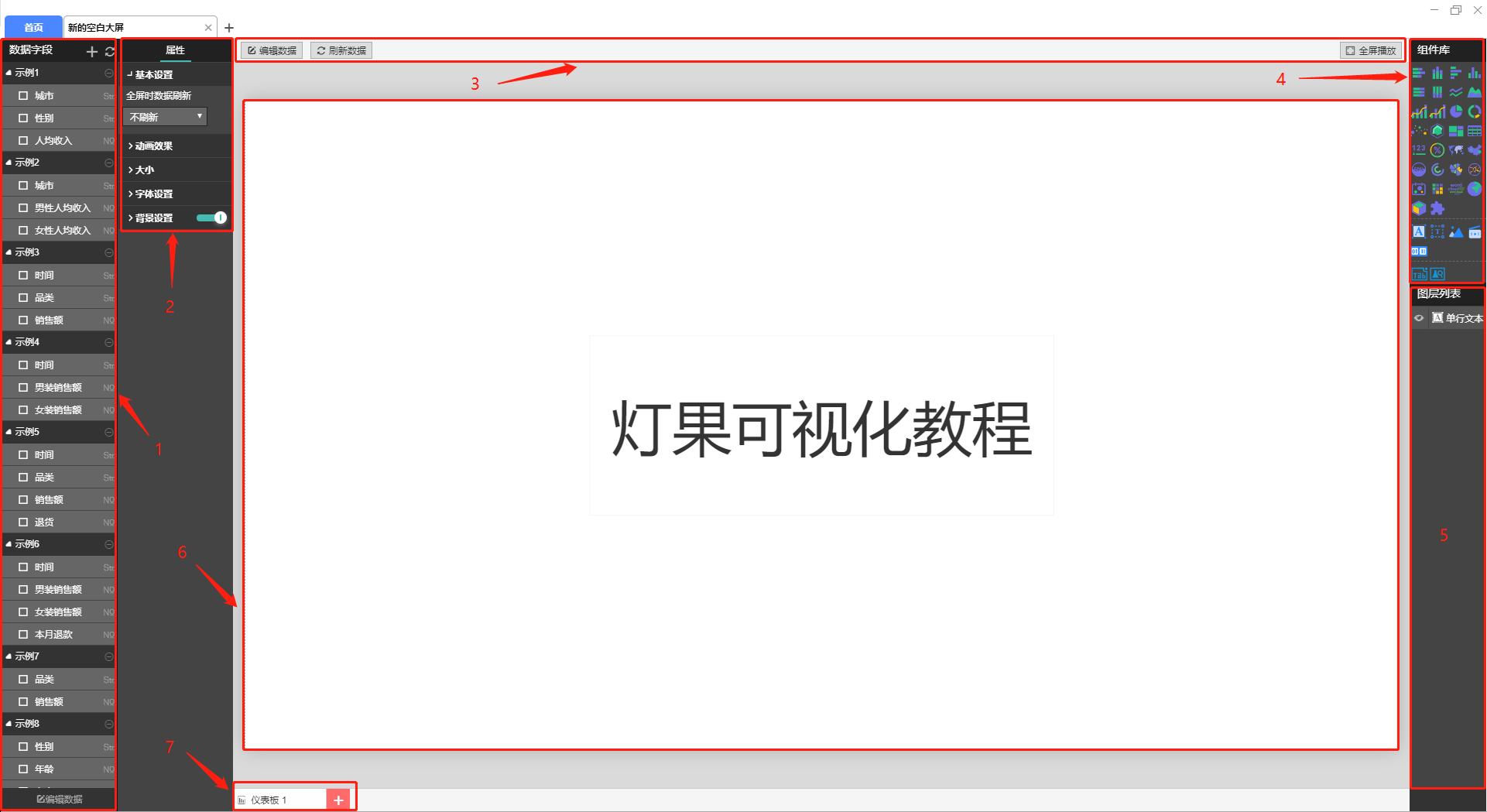 7、仪表板标签:同一个大屏项目中可以包含一个或多个子大屏,点击标签右侧的加号可以新建子大屏,双击标签可以修改标签名称