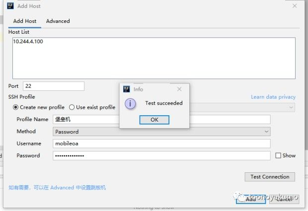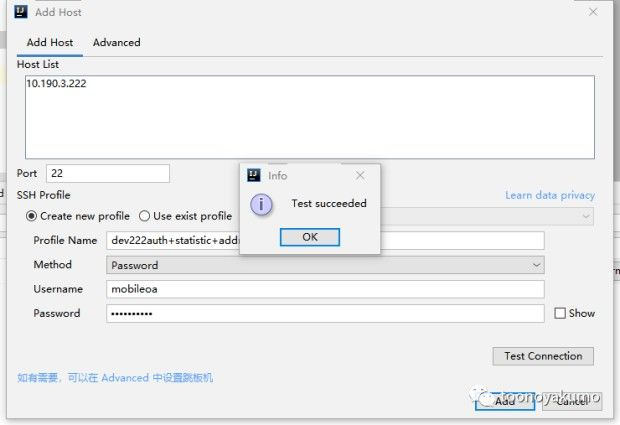 记得测试下连接,点击 add ,然后配置目标机器的信息