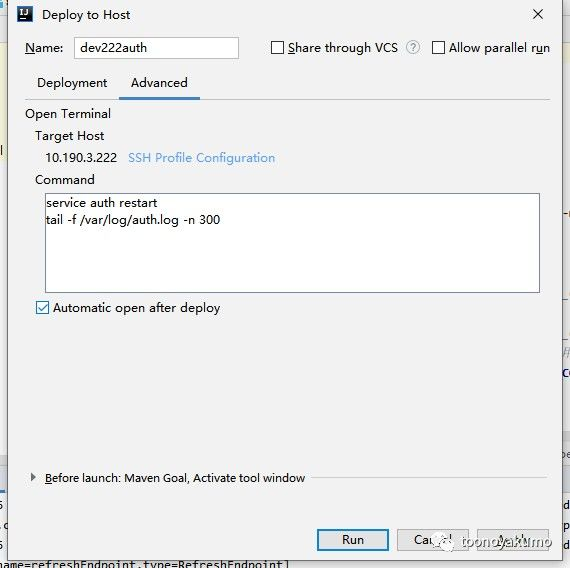 切换到 Advanced ,这里面可以配置打包上传后,在目标机器将做什么样的操作,例如 我需要重启(你可以先给文件改名)然后看下日志