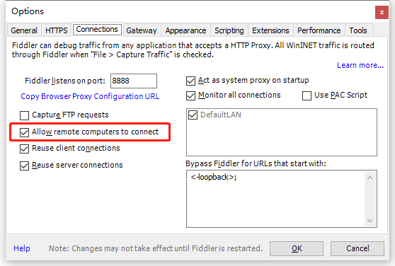 勾选 Allow remote computers to connect 然后重启Fiddler(很重要)