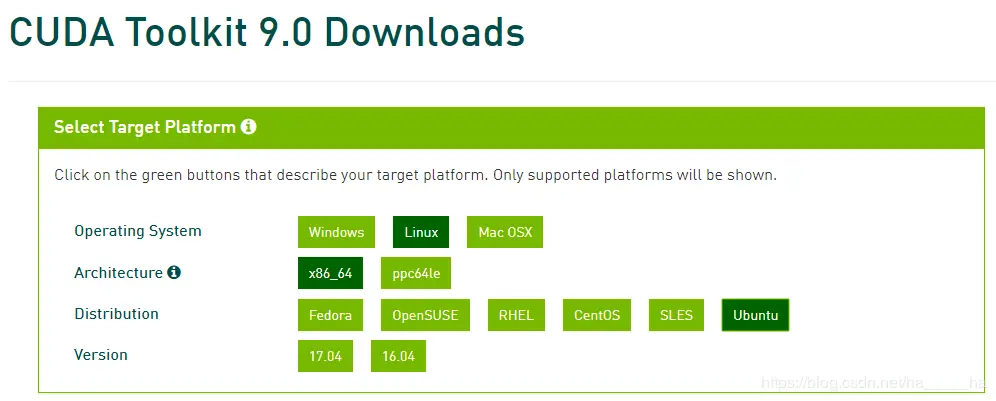 cuda和cudnn、pytorch版本之间要保证对应,能够支持。以下网址中有之前各版本的cuda下载(https://developer.nvidia.com/cuda-toolkit-archive),本文选择的是cuda9.0,根据系统环境选择合适的版本下载,有补丁的连补丁一同下载。关于Ubuntu系统一项,记住一个原则:高版本兼容低版本。即cuda9.0只有14.04和16.04两个选项,但18.04版本兼容这两个版本,所以cuda9.0也可以用于18.04版本的Ubuntu。