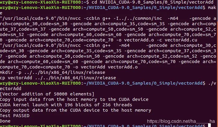 cd NVIDIA_CUDA-9.0_Samples/0_Simple/vectorAddmake./vectorAdd 出现下面的Test PASSED代表CUDA安装成功。