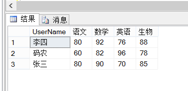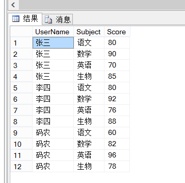 INSERT INTO [StudentScores] SELECT '张三', '语文', 80 INSERT INTO [StudentScores] SELECT '张三', '数学', 90 INSERT INTO [StudentScores] SELECT '张三', '英语', 70 INSERT INTO [StudentScores] SELECT '张三', '生物', 85 INSERT INTO [StudentScores] SELECT '李四', '语文', 80 INSERT INTO [StudentScores] SELECT '李四', '数学', 92 INSERT INTO [StudentScores] SELECT '李四', '英语', 76 INSERT INTO [StudentScores] SELECT '李四', '生物', 88 INSERT INTO [StudentScores] SELECT '码农', '语文', 60 INSERT INTO [StudentScores] SELECT '码农', '数学', 82 INSERT INTO [StudentScores] SELECT '码农', '英语', 96 INSERT INTO [StudentScores] SELECT '码农', '生物', 78