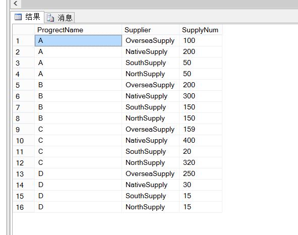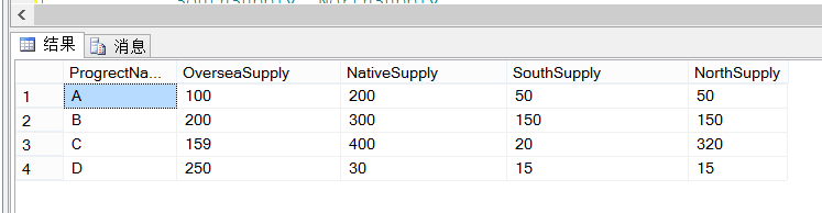 e.g: 测试数据准备 CREATE TABLE ProgrectDetail ( ProgrectName NVARCHAR(20), --工程名称 OverseaSupply INT, --海外供应商供给数量 NativeSupply INT, --国内供应商供给数量 SouthSupply INT, --南方供应商供给数量 NorthSupply INT --北方供应商供给数量 )
