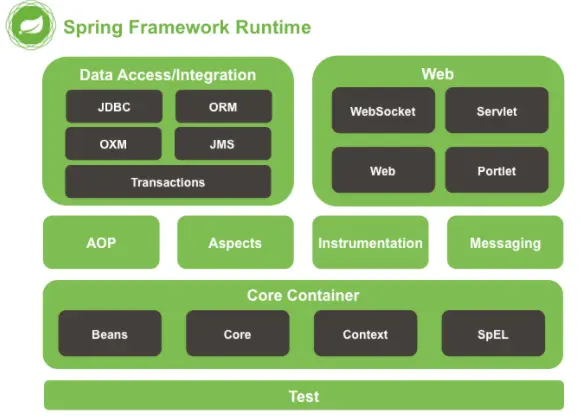 Spring 框架是一个分层架构,它包含一系列的功能要素,并被分为大约20个模块,如下图所示: