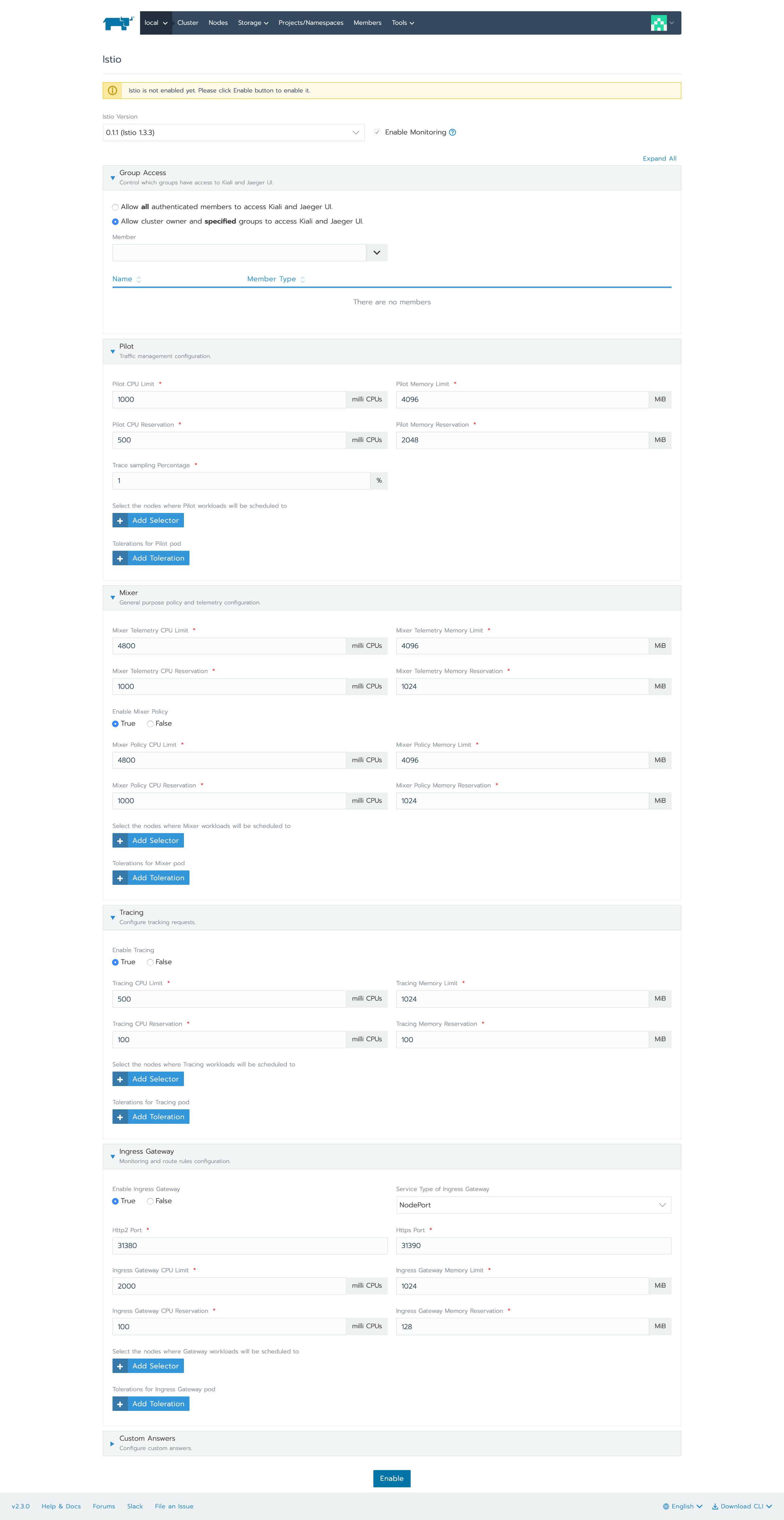 要启用Istio,你需要访问UI上方的菜单栏,其路径是:工具> Istio。你可以更改许多配置选项。而现在,我想让所有配置都保持默认状态并将ingress网关设置为True。启用这一功能还将启用监控功能,这是Istio正常运行的先决条件。