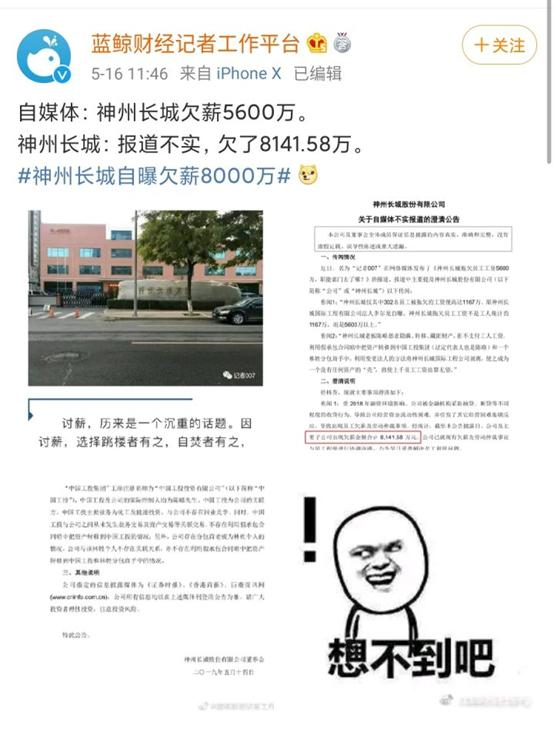 【5月】自媒体爆料上市企业欠薪5600万 企业回应报道不实 欠了8100万