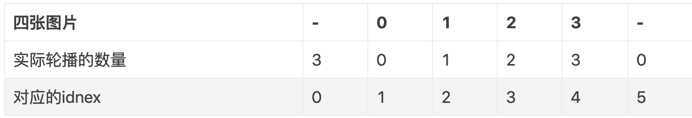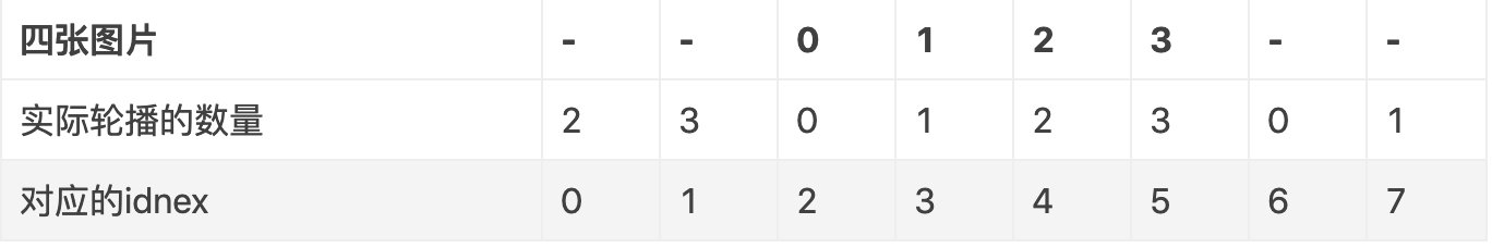 - 一屏三页 还是以4张图片举个例子,一屏三页,一次要展示三张图片,相当左右两边都加载了一张图片,也就是多加载了2张图片,需要的数量:needCount(8) = count(4) + 4 ,实际轮播是有8张,存放在banner对应: