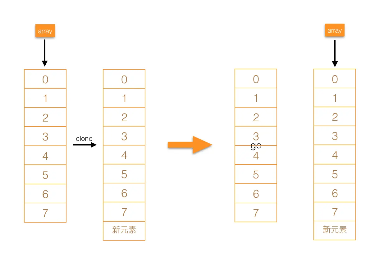 也就是是说,每次添加元素的时候,都会把原数组复制一次,并把复制后的数组长度加 1,然后把元素添加进数组,最后用新数组去替代旧数组,完成添加。这样 CopyOnWriteArrayList 根本就不需要扩容,因为每次添加元素都是一个扩容的过程。