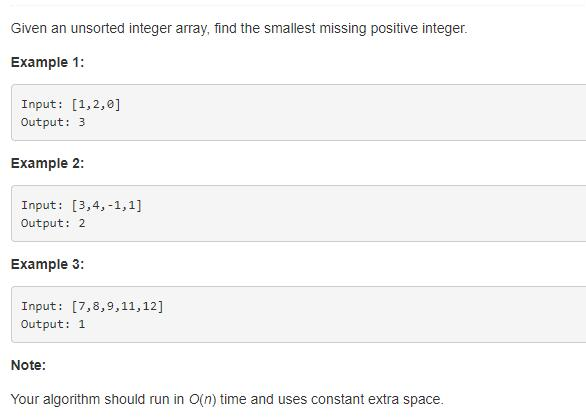 给一串数字,找出缺失的最小正数。限制了时间复杂度为 O(n),空间复杂度为 O(1)。