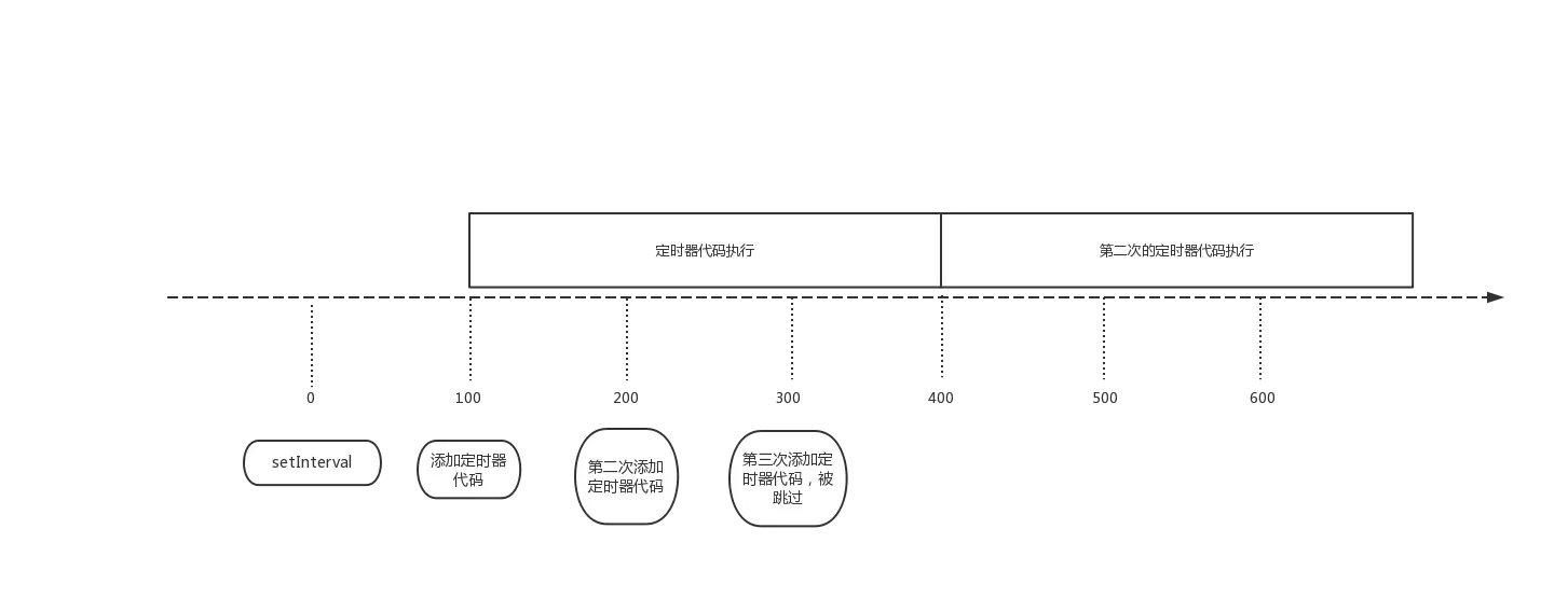 300 毫秒时,第一次的定时器代码还在执行中,第二次的定时器代码在事件队列末端等待执行。因为该定时器已经有第二次的代码在队列中等待了,所以这一次的代码不会被推入队列,被忽略了。