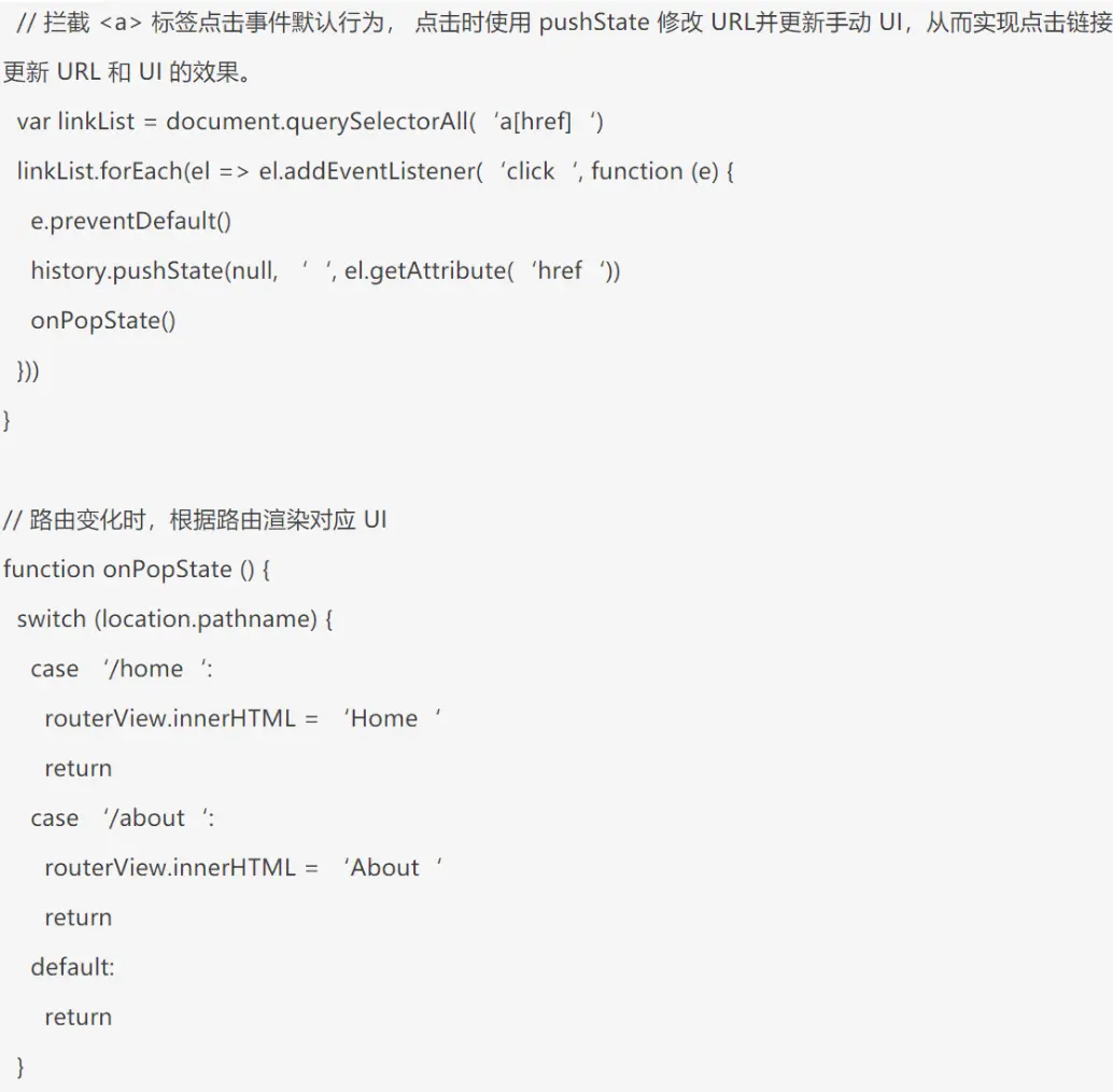 history.pushState() 在保留现有历史记录的同时,将 url 加入到历史记录中。 history.replaceState() 会将历史记录中的当前页面历史替换为 url。 由于 history.pushState() 和 history.replaceState() 可以改变 url 同时,不会刷新页面,所以在 HTML5 中的 histroy 具备了实现前端路由的能力。