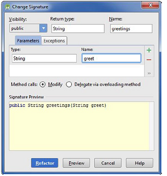 public String greetings(String message){ return "Hello " + message; } 将光标移到单词greetings上面(高亮的粗体字)并按Ctrl+F6 |Cmd+F6,或导航到Refactor ➤ Change Signature。结果对话框会允许你修改方法的签名,如图4-3所示。