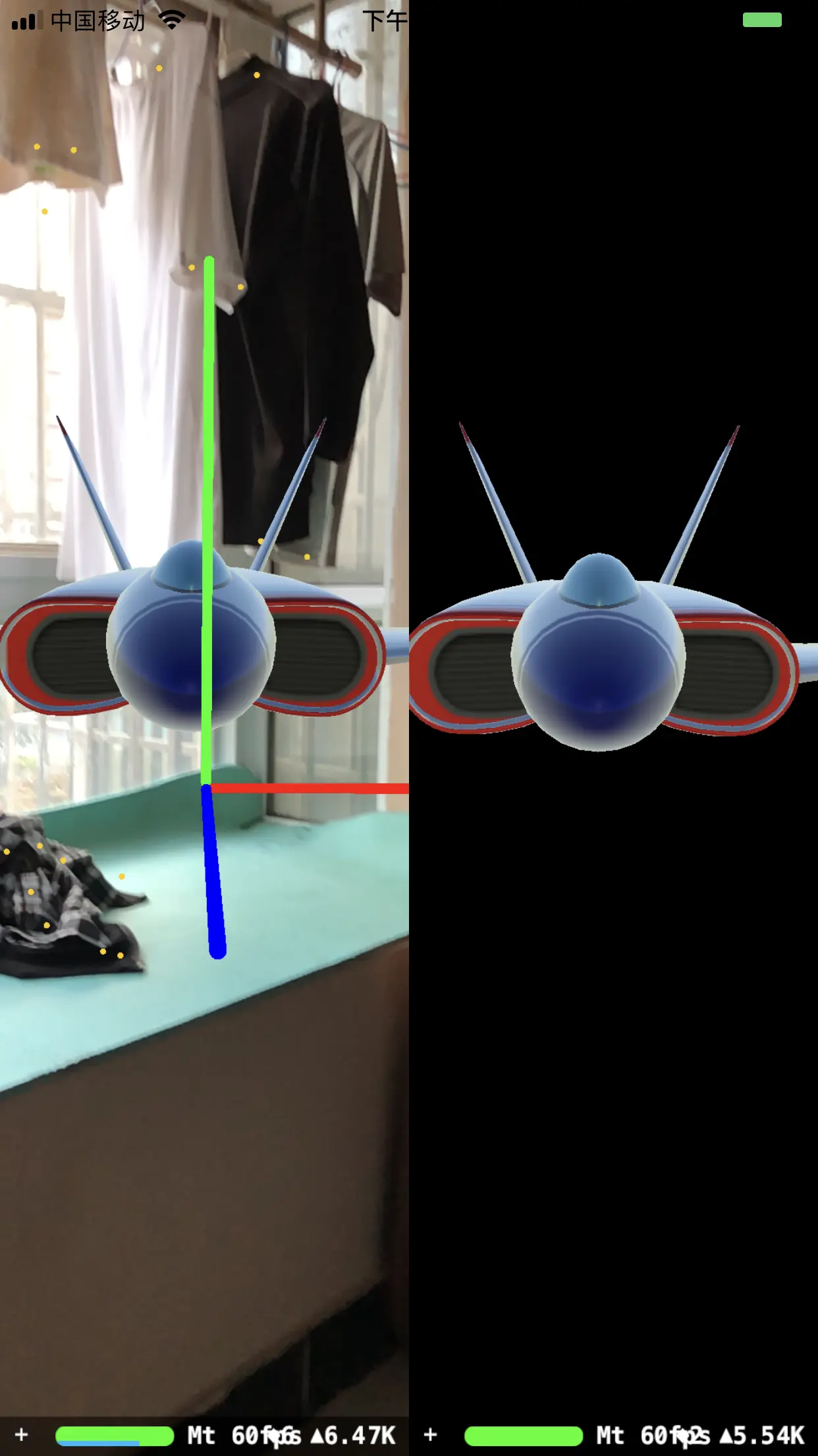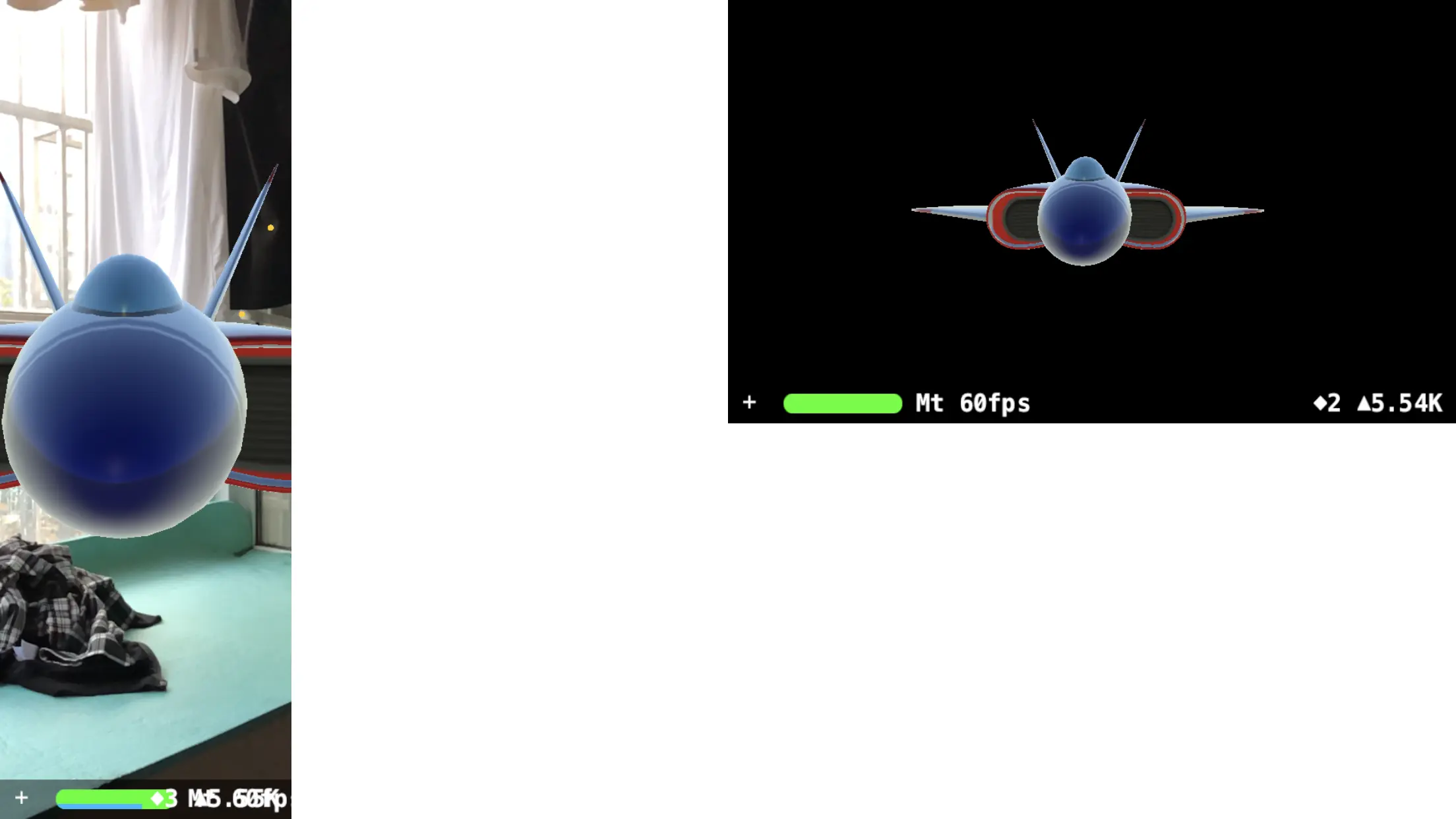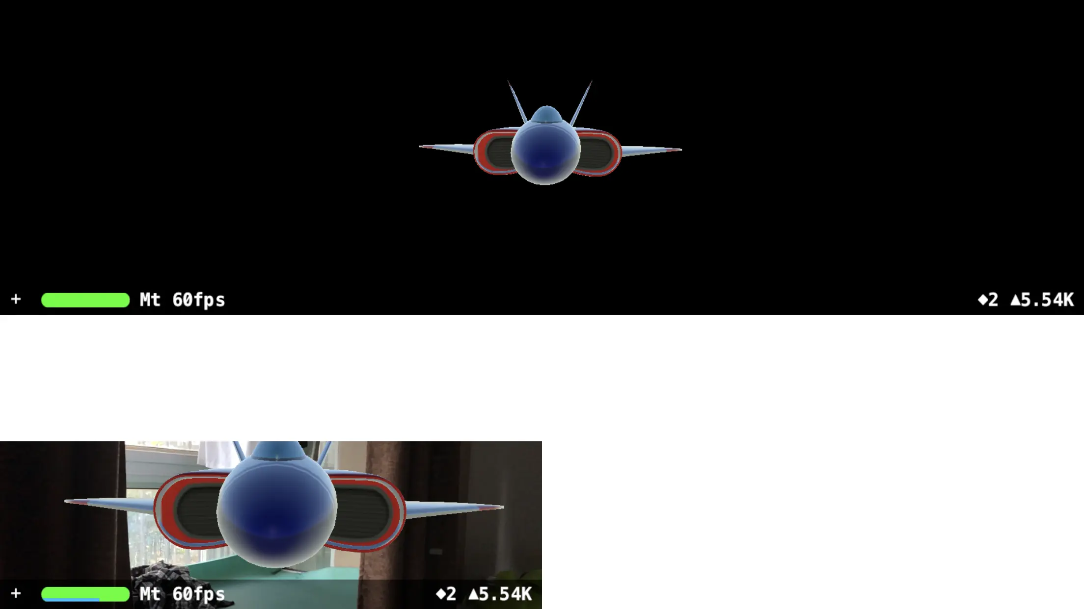 这到底是什么意思?我们来看几张对比图就知道了。下图的 demo 中一个有背景的是 ARSCNView,另一个黑色背景的是 SCNView。两者的 3D 模型位置、大小相同,相机参数包括位置也是相同的。先看竖屏时的情况: