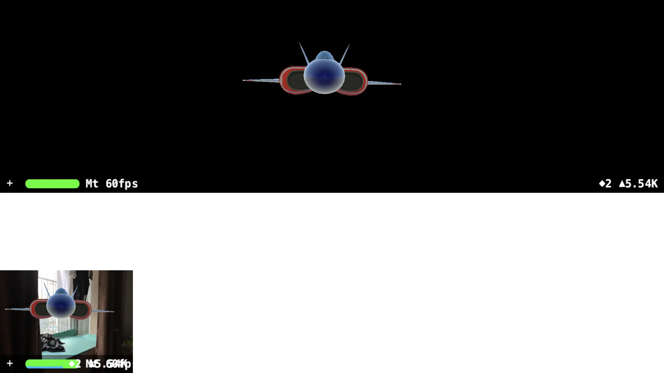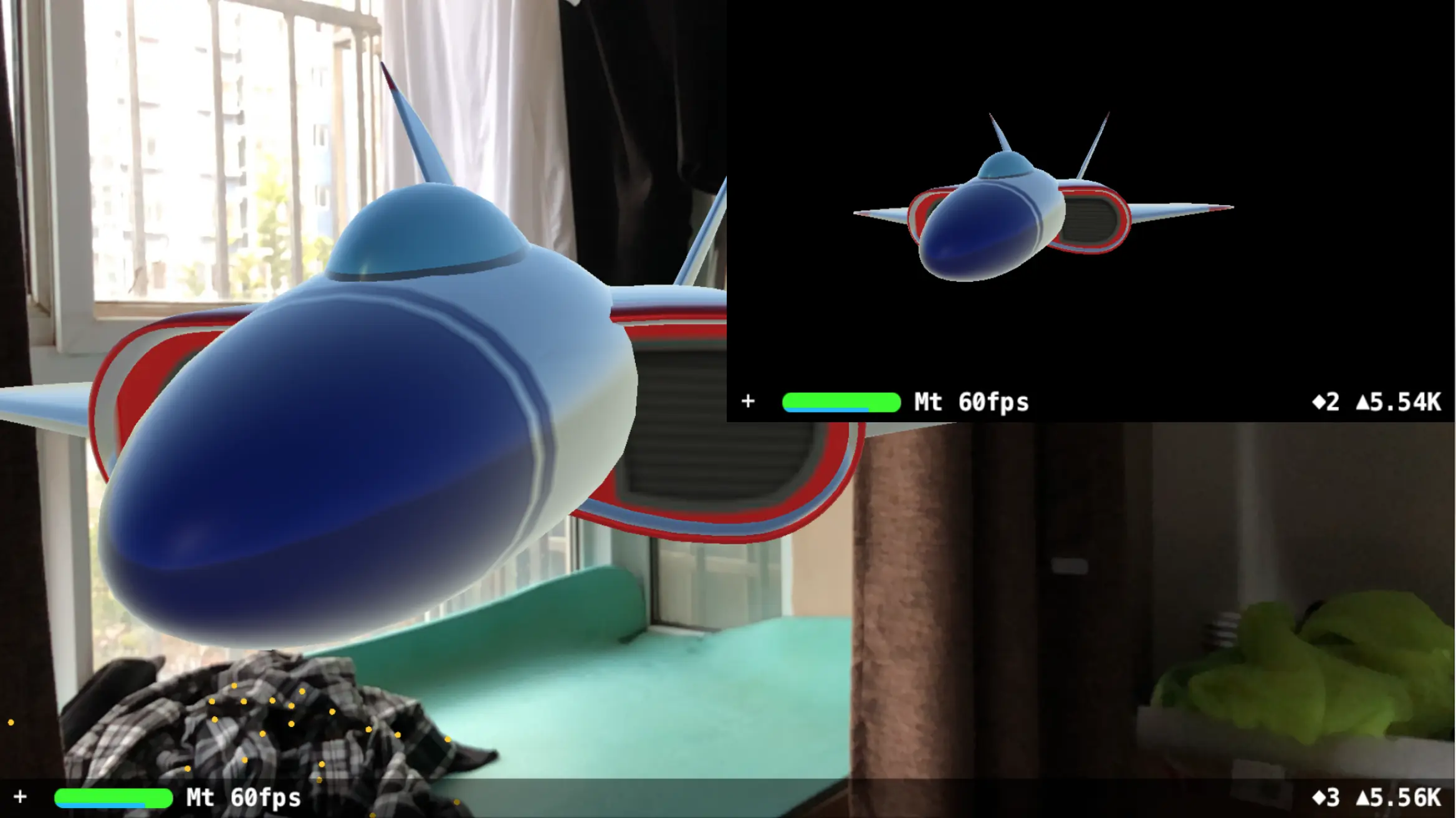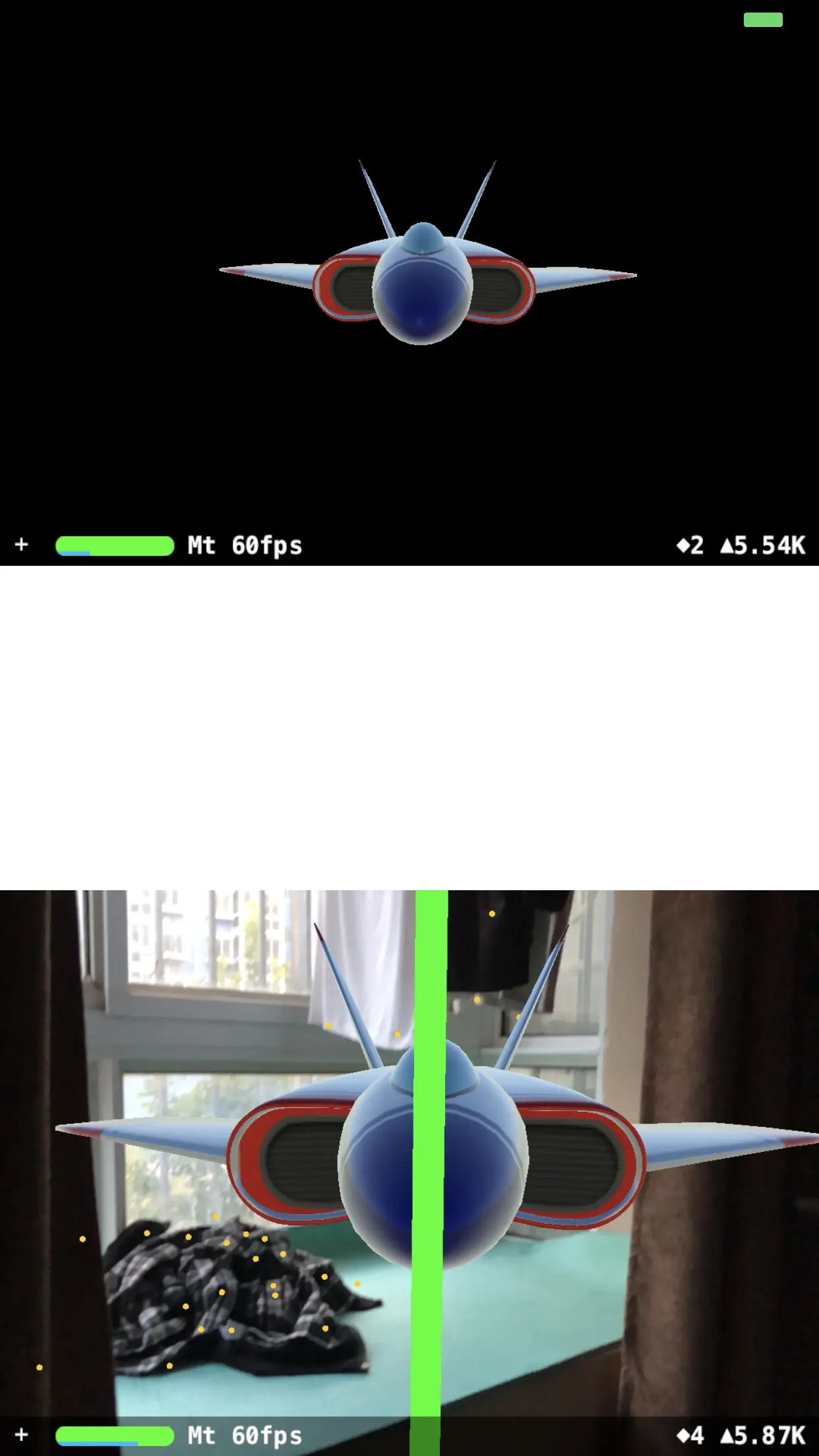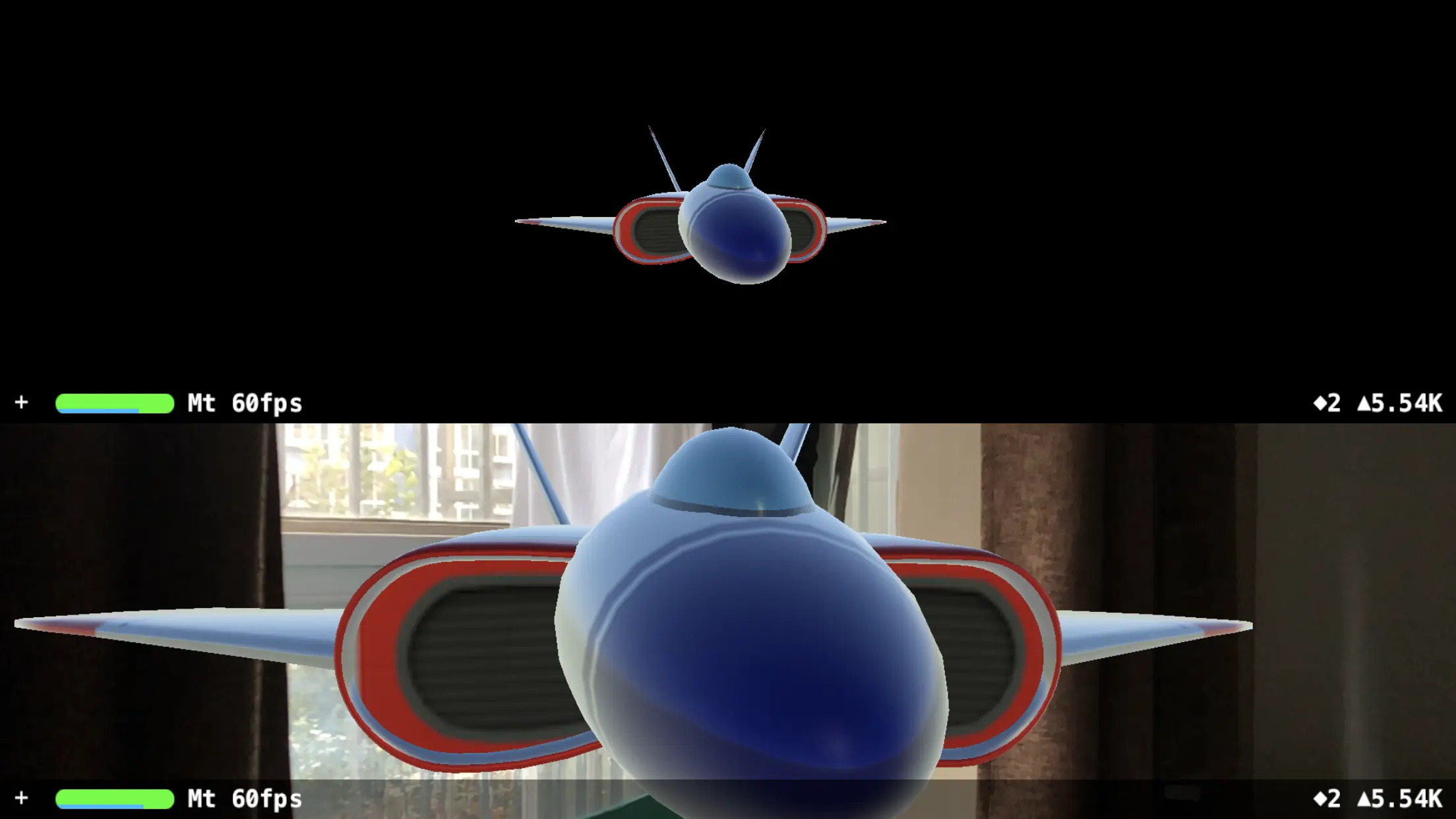 这到底是什么意思?我们来看几张对比图就知道了。下图的 demo 中一个有背景的是 ARSCNView,另一个黑色背景的是 SCNView。两者的 3D 模型位置、大小相同,相机参数包括位置也是相同的。先看竖屏时的情况:
