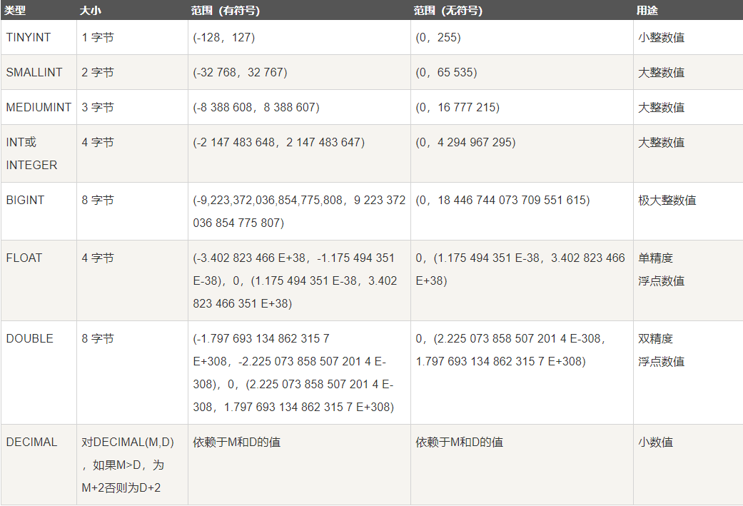 作为SQL标准的扩展,MySQL也支持整数类型TINYINT、MEDIUMINT和BIGINT。下面的表显示了需要的每个整数类型的存储和范围。