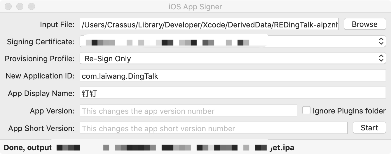 然后编译工程,生成一个Mac 签名程序界面是这样的,点击Start,等待一段时间出现Done表示重签名成功!