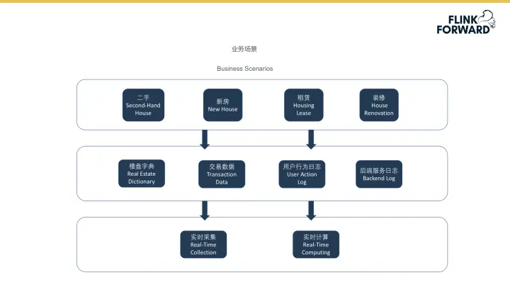 下图为贝壳找房的业务场景示意图。最上层为贝壳找房公司最为主体的四大业务:二手房交易、新房交易、租赁业务及装修业务。四大业务运营将产生图示中间部分的四大数据即楼盘字典、交易数据、用户行为日志与后端服务日志。图示最下部分代表公司实时数据采集、实时数据计算的业务模块,本文中的案例将重点介绍数据实时计算部分的设计、实现及应用内容。
