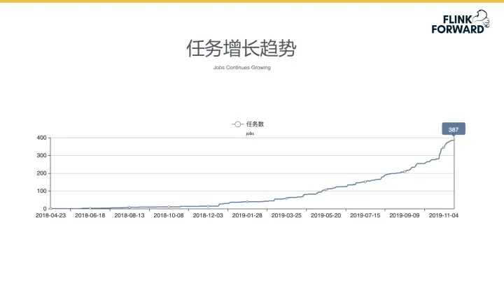 最开始平台上线时支持的任务增长较为缓慢,在2019年6月初,平台升级到Flink并全面支持SQL开发后,任务数量开始大规模的增长,在2019年11月份实时数仓建成后,平台所支持的任务数量有了十分明显的增长趋势。