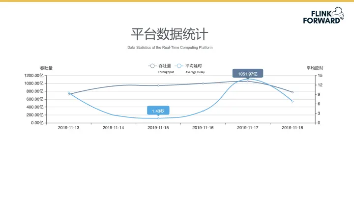 下图所示为平台每日数据统计。目前平台每日可以处理1000亿条数据,一般数据任务的处理延迟在40毫秒左右。