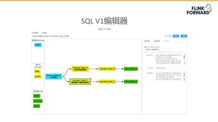 下图所示为SQL V1编辑器示意图。该编辑器对于大部分数据清洗及数据处理的业务场景可以实现简洁高效的编辑处理。用户在编辑器左侧可以定义编辑数据源、操作符及目标源等数据信息。中央面板上呈现的数据为SQL V1支持编辑的操作类型,选中面板中央的过滤器,即可在编辑器右侧添加相关的过滤条件,实现数据的相关过滤。在目标源层面,编辑器目前支持Kafka、Druid等多种目标源,大大提升了编辑器的兼容性。