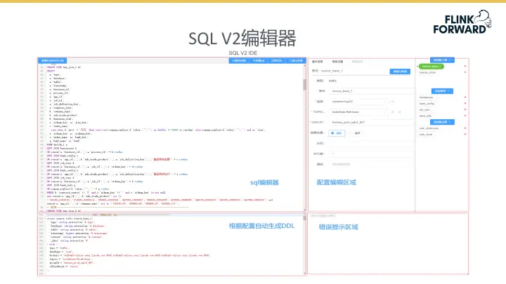 下图所示为SQL V2编辑器示意图。目前SQL V2是基于Flink SQL技术较为完善的编辑器,左侧为用户进行代码编辑的部分,用户在此处可以编辑大量SQL语句以此助力不同业务场景。左下栏目中的数据为用户选中数据源自动生成的DDL,通过DDL编辑器将操作数据的样式更清晰的展示给用户。SQL V2支持了三大类型的数据表,分别是source表、sink表及维表,以此方便用户的开发。编辑器右下角可以呈现SQL语法的检测情况,以此提示用户在编辑时出现的语法错误。