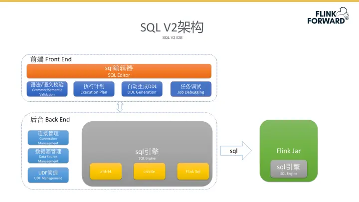 SQL V2工具整体架构如下图所示。前端SQL编辑器模块包括语法语义的检查、执行计划的查看、自动DDL的生成及任务调试的功能。用户通过任务调试功能可以查看任务执行结果。后台将引擎提交到Yarn集群上执行,引擎通过任务id回调后台接口获取需要执行的SQL,对SQL做语法校验和语法解析,若出现维表关联则会额外对SQL做一层转换。