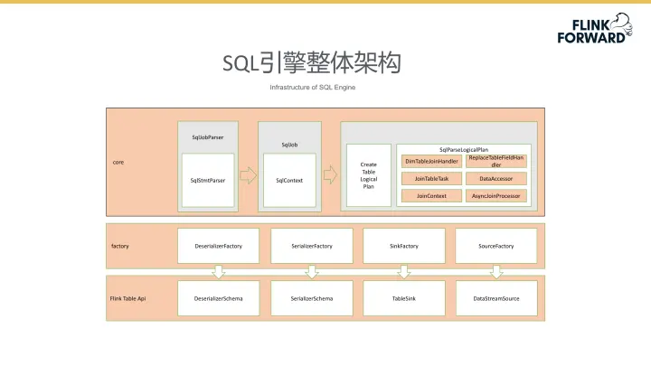 下图所示为SQL引擎的整体架构。整体架构分为三个层次,最底层为Flink Table API。在Flink层之上企业设计了代码的封装,以factory的形式方便最上层的方法调用。最上层的core层负责整个系统的SQL解析。