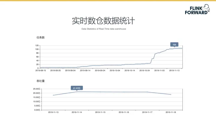下图所示为企业实时数仓的数据统计。从2019年8月,SQL V2正式上线运营,至2019年10月平台开始支持实时数仓开发,系统的数据量开始加速增长。目前,实时数仓已经有100余个任务,数据吞吐量也达到了21亿条/天的数据级别,数据规模较为可观。