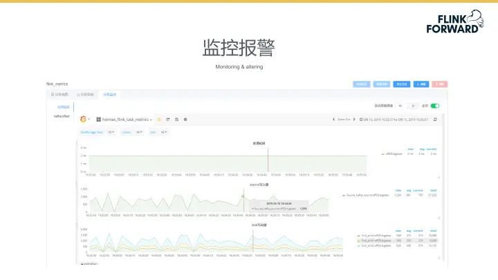 下图为平台的监控报警页面截图。监控系统会实时监控平台任务的处理延时、source写入量及sink写出量三大指标。系统中同时可以设置平台数据的无心跳时间,当超出设置时限后,系统将会进行报警。