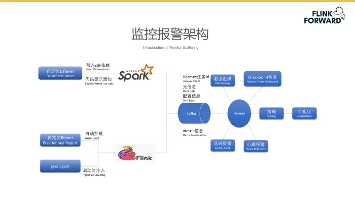 下图为监控报警架构图。监控系统通过自定义的Listener对Spark进行监控,Listener引入SDK收集Spark任务的信息及运行中的日志数据。用户在此处需要进行手动SDK的导入。在Flink应用模块中,系统设计支持了自定义Report数据的获取,并通过自动加载的方式直接载入Flink中进行数据的分析与计算,同时通过任务启动是注入java探针的方式获取任务的相关信息。所有的监控信息将被统一送到Kafka Topic中,经Hermes平台分析处理,触发相应的延时报警及心跳报警。