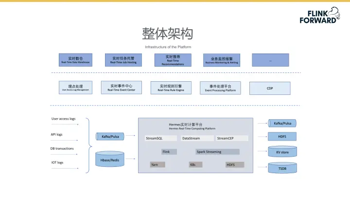 实时计算平台的整体架构如下图所示。在架构中间部分,平台包含了实时事件中心、事件处理平台等系统来更好的处理未来企业中的业务场景需求,以通用服务平台的方式为更多的业务方提供统一的业务支撑。在引擎方面,未来会深入研究Flink的状态管理、端到端的精确一次等技术,提高数据处理的准确性和一致性。