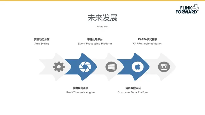 未来将会建设平台的资源动态分配能力,根据任务的历史运行情况自动分配资源。用户可以在事件处理平台上定义各种事件,实时的对事件进行分析,并产生相关的数据报表。用户通过实时规则引擎用以完成各种业务规则的配置,事件命中规则后触发相关的业务操作。用户数据平台汇集各个产品、各个端的用户数据,提供用户行为的实时查询、分析,更加高效的支持营销、推荐等业务场景。实时数仓建设方面会进行KAPPA模式的探索,推进流批一体化建设,提升历史数据的处理和查询能力。