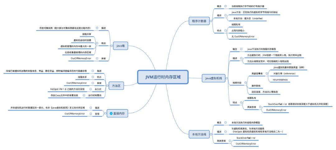 Java 虚拟机在执行 Java 程序的过程中会把它管理的内存划分为若干个不同的数据区域。它们各有用途,有些随着虚拟机进程的启动一直存在(堆、方法区),有些则随着用户线程的启动和结束而建立和销毁(程序计数器、虚拟机栈、本地方法栈)。