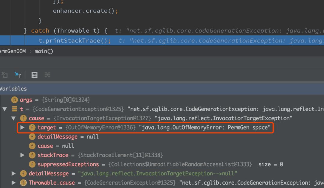 public class PermGenOOM { public static void main(String[] args) { try { while (true) { Enhancer enhancer = new Enhancer(); enhancer.setSuperclass(OOMObject.class); enhancer.setUseCache(false); enhancer.setCallback(new MethodInterceptor() { public Object intercept(Object o, Method method, Object[] objects, MethodProxy methodProxy) throws Throwable { return methodProxy.invoke(o, objects); } }); enhancer.create(); } } catch (Throwable t) { t.printStackTrace(); } }}