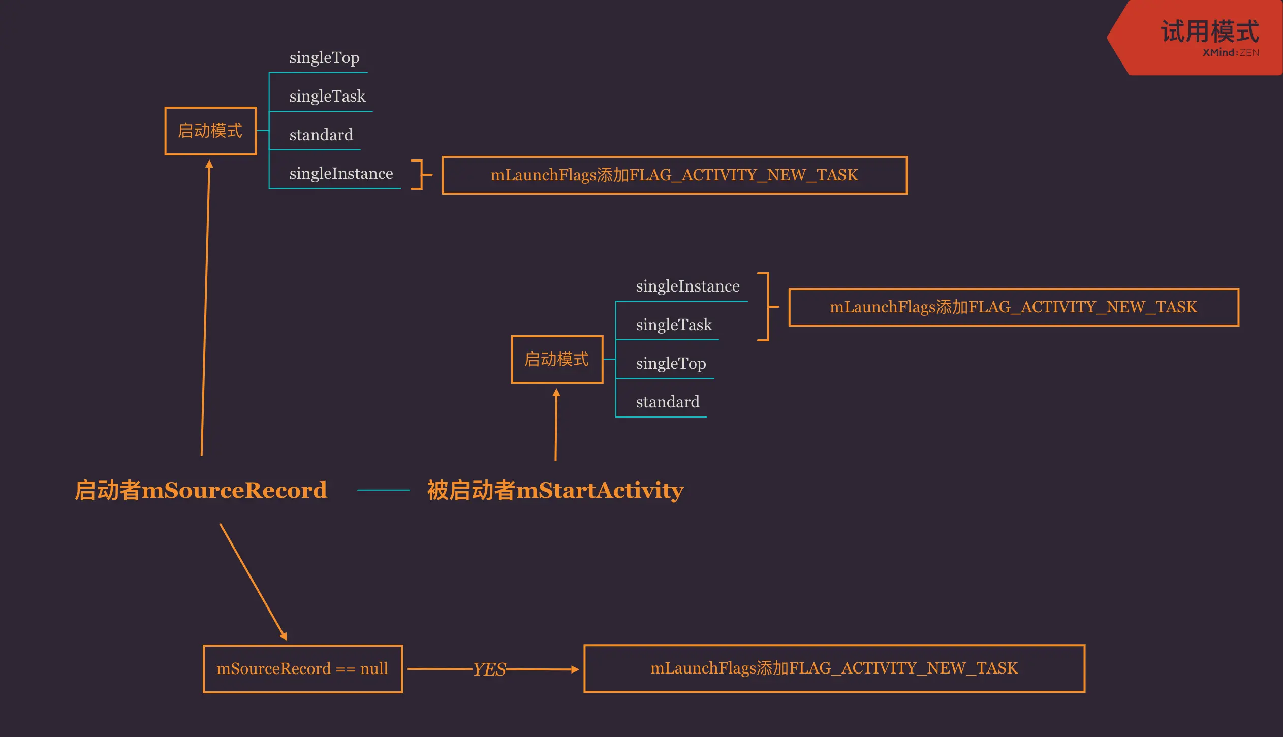- 如果启动者mSourceRecord是一个 SingleInstance 类型的Activity,那么被启动者的mLaunchFlags就会加上 FLAG_ACTIVITY_NEW_TASK