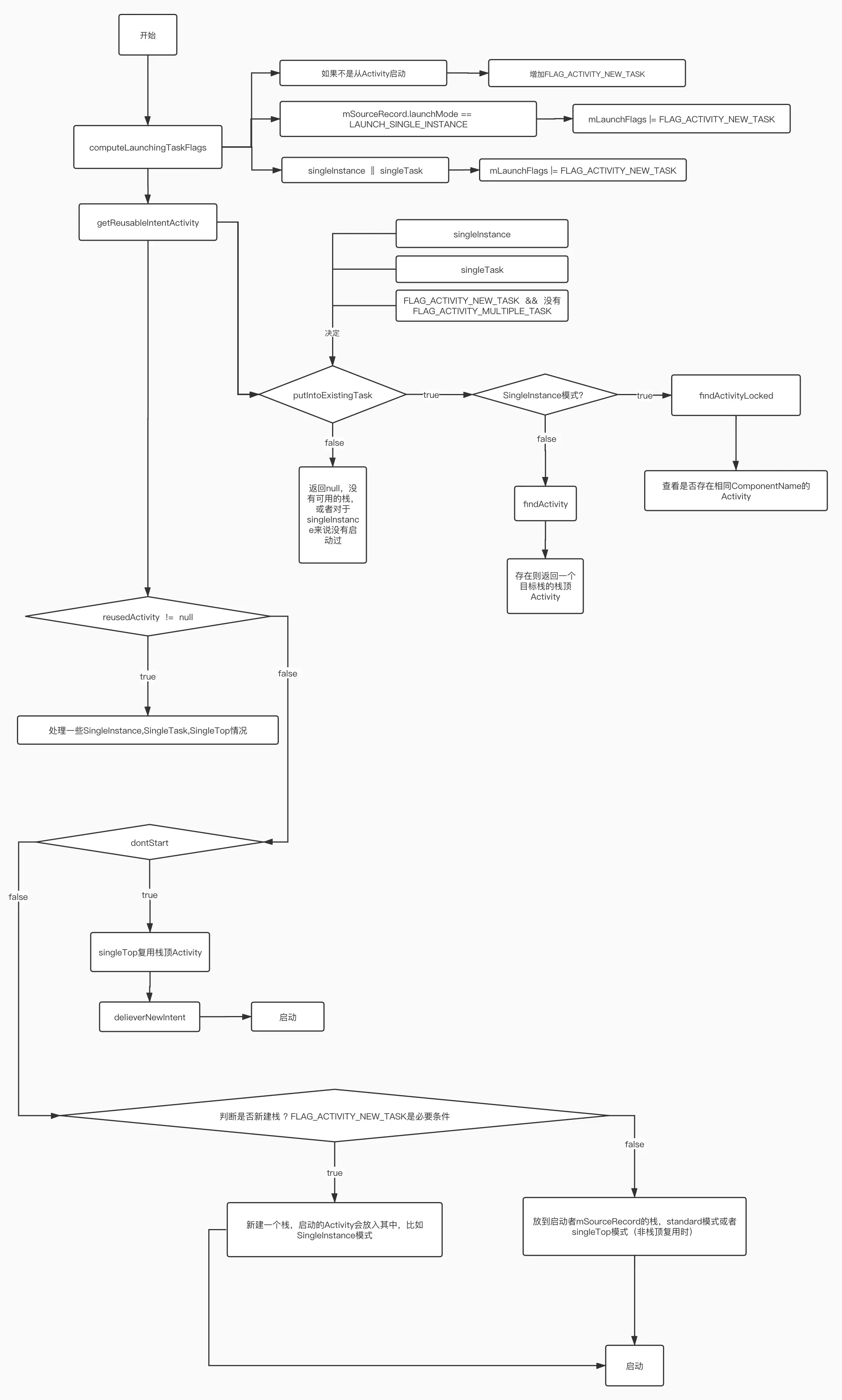 - 如果被启动者mStartActivity是SINGLE_INSTANCE或者SINGLE_TASK 类型的Activity,被启动者的mLaunchFlags都会加上FLAG_ACTIVITY_NEW_TASK