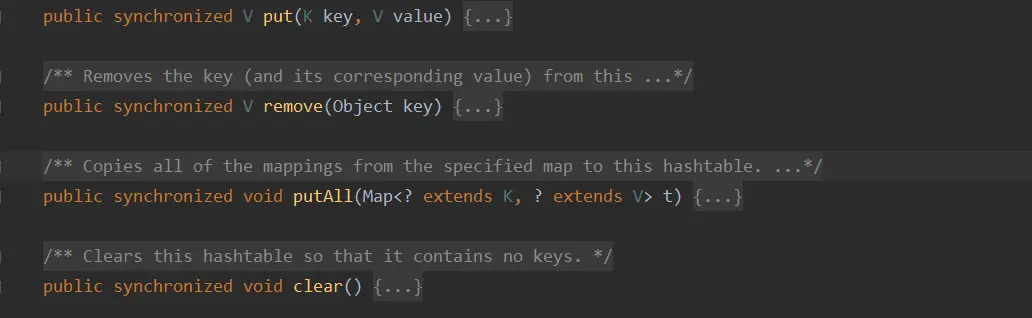 但是为什么HashTable是线程安全的呢,因为在HashTable内部,给每个方法都加上了同步锁Synchronized,也就是悲观锁,每次只能确保一个线程对HashTable进行操作,其它线程是都需要排队的,虽然它支持高并发,但是,他的并发度是不够的,很容易造成大规模阻塞。