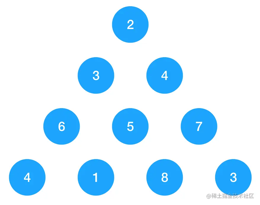 如图示,以上三角形由一连串的数字构成,要求从顶点 2 开始走到最底下边的最短路径,每次只能向当前节点下面的两个节点走,如 3 可以向 6 或 5 走,不能直接走到 7。