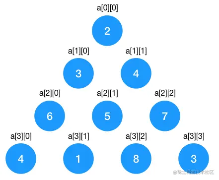 首先我们需要用一个二维数组来表示这个三个角形的节点,用二维数组显然可以做到, 第一行的 2 用 a[0][0] 表示,第二行元素 3, 4 用 a[1][0],a[1][1],依此类推。