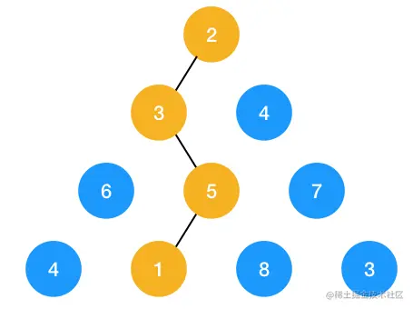 如图示:从 2 走到最底下最短路径为 2+3+5+1 = 11,即为我们所求的