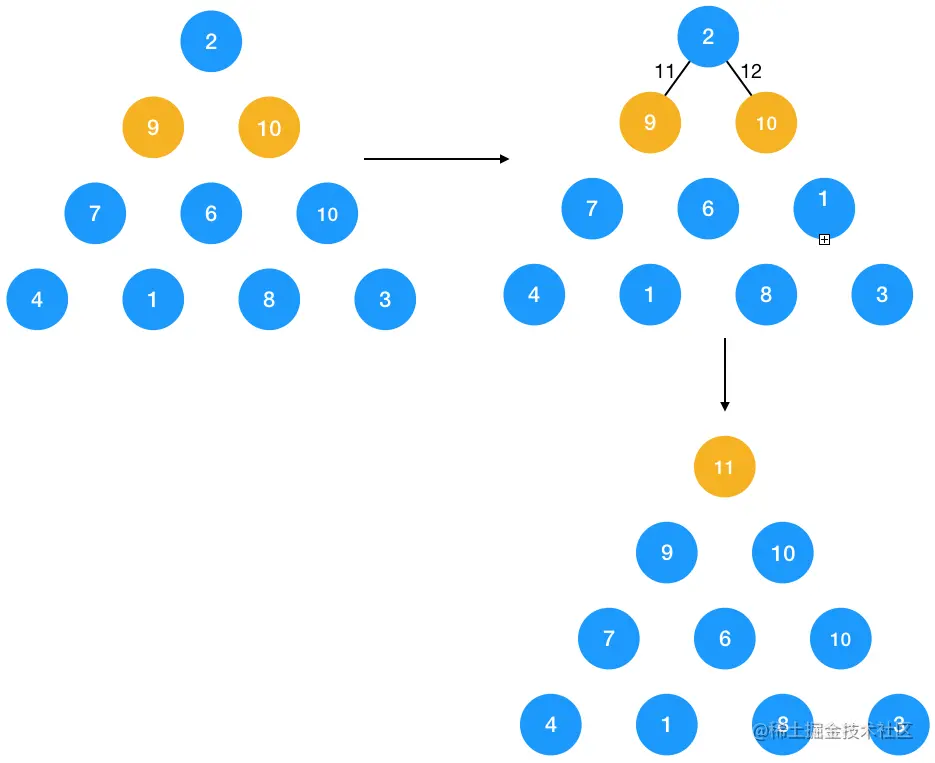 接下来要求 2 到底部的路径就很简单了,只要求 2 到节点 9 与 10 的最短路径即可,显然为 11。