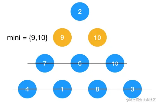 当自下而上遍历完成了,mini[0] 的值即为 DP[0,0],即为节点 2 到 底部的最短路径。mini 的定义可能有点绕,大家可以多思考几遍,当然,你也可以定义一个二维数组来保存所有的 DP[i,j],只不过多耗些空间罢了。