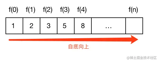 画外音:从最终地不能再分解的子问题根据递推方程(f(n) = f(n-1) + f(n-2))逐渐求它上层的问题,上上层问题,最终求得一开始的问题,这种求解问题的方式就叫自底向上。